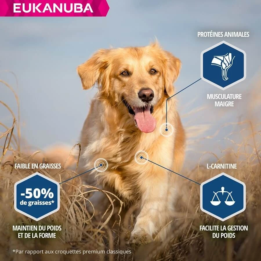 Redonnez de la vitalité à votre compagnon avec cet aliment qui contient 15 % de matières grasses en moins qu’Eukanuba Croquettes Chiens Adultes et de bons ingrédients, comme la L-carnitine qui réduit la graisse corporelle tout en préservant la masse musculaire maigre.